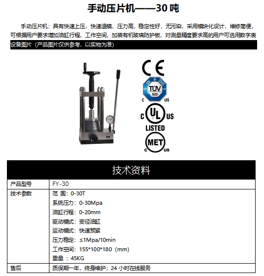 手動(dòng)壓片機(jī):具有快速上壓,快速退模,壓力高,穩(wěn)定性好,無污染,采用模塊化設(shè)計(jì),維修簡便,可根據(jù)用戶要求增加油缸行程,工作空間,加裝有機(jī)玻璃防護(hù)板,對(duì)測(cè)量精度要求高的用戶可選用數(shù)字表